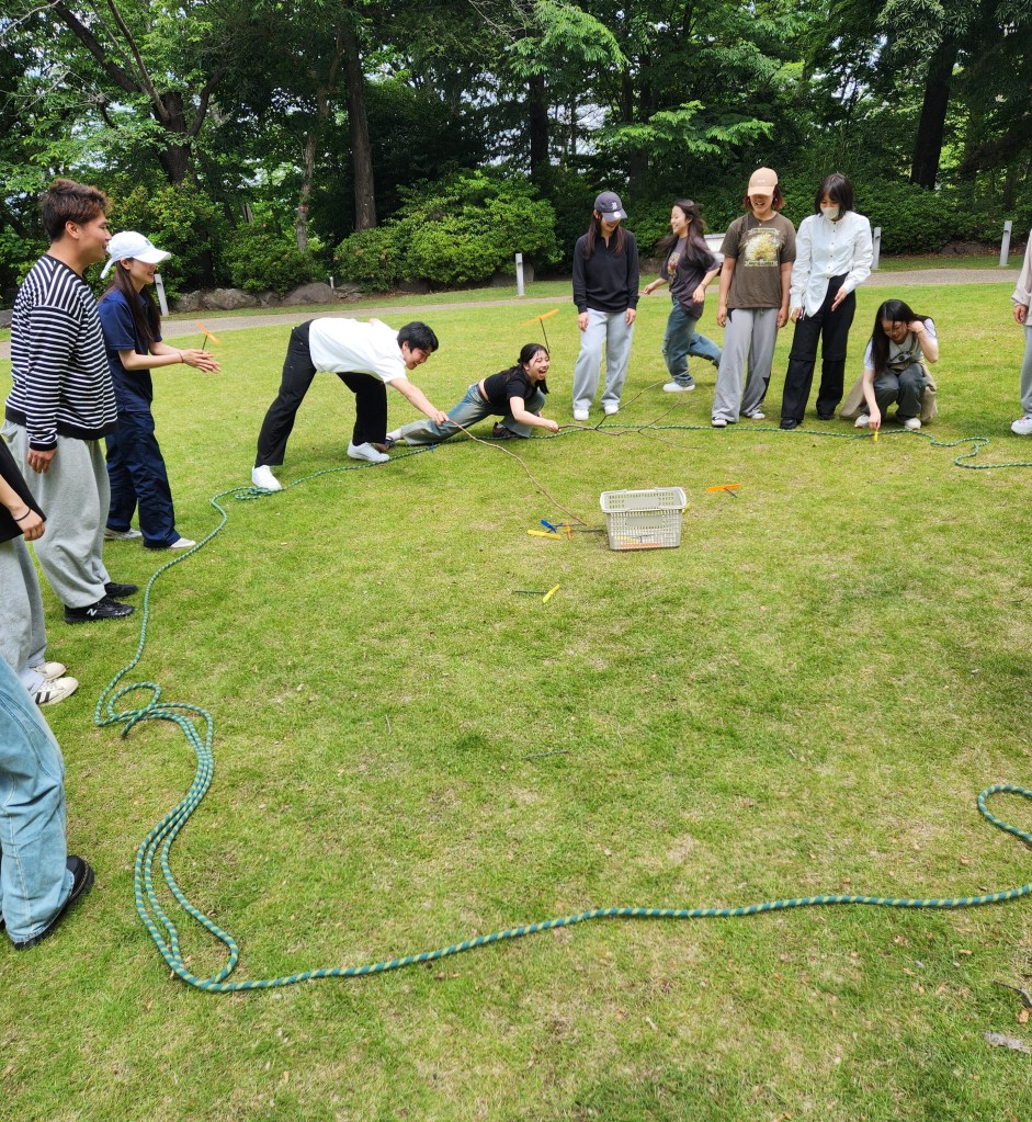 竹とんぼのプラスチック版(プラトンボ)を籠の中に入れる課題解決に挑戦!ただし、ロープの中に入ることは何人たりとも出来ません!